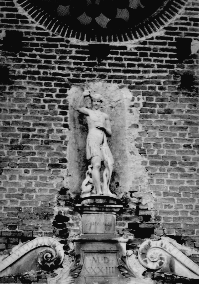 - NOTIZIE STORICO CRITICHE Anche per questa statua l'esecuzione meno accurata fa ritenere un controllo non così efficace della Bottega, come invece avviene per la parte superiore del portale. Per le referenze fotografiche si veda anche: Museo Civico di Torino - scatola n° 15, fot. n° 118, Arti grafiche Bergamo. L'oggetto risulta catalogato in una vecchia scheda incompleta, non firmata e non datata (1920 ca.)