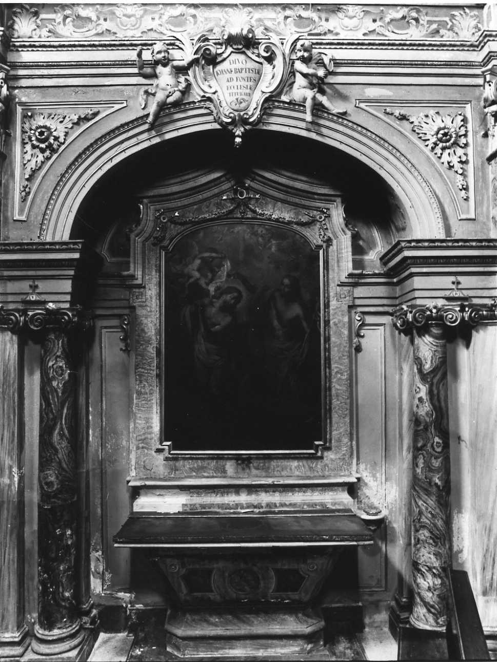 La cappella è inserita in un arcone sostenuto da due colonne con capitelli ionici. L'arco è sormontato da uno stemma sostenuto da due angeli. Sull'altare una tela del Taricco rappresentante il battesimo di Gesù. Gli stucchi sono grigio chiaro e bianchi con cornici dorate, le colonne variegate sul marrone