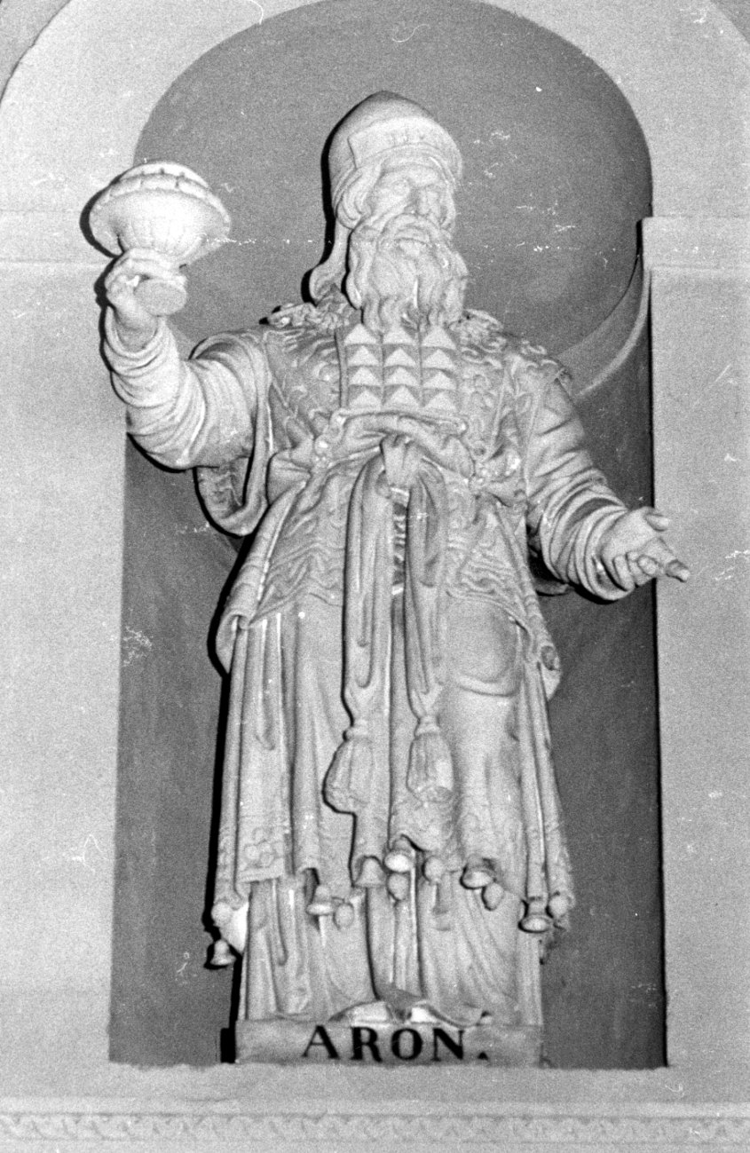 ll profeta, collocato entro nicchia, veste un lungo abito da gran sacerdote arricchito di ornamenti vari e frangiato con campanelle; ha in capo una specie di tiara e porta sul petto il Razionale, una placca ornata di 12 pietre simboleggianti le dodici tribù di Israele. Regge con la mano un vaso per unguenti. Questa rappresentazione è fedele ai moduli iconografici tradizionali