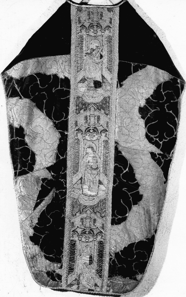 - NOTIZIE STORICO CRITICHE Il parato, menzionato da A. ROCCAVILLA, L'arte nel biellese, Biella 1905, pp. 129-130; G. FONTANELLA, Biella e il Biellese, Biella 1969, p. 248; V. BARALE, Il Principato di Masserano e il Marchesato di Crevacuore, Vercelli 1987, pp. 238-239; D. LEBOLE (a cura di), I Tesori di Masserano, catalogo della mostra di Masserano, Quart 2002, p. 6, è stato oggetto di studio da G. L. BOVENZI, Tessuti e ricami, in V. NATALE (a cura di), Arti figurative a Biella e a Vercelli. Il Quattrocento, Candelo 2005, pp. 155-158. Il corpo della veste liturgica è formato da numerosi frammenti di velluto tagliato operato ad un corpo rosso broccato, integrato, soprattutto nella zona delle spalle e del petto, da alcuni pannelli di velluto tagliato ad un corpo color rosso, In assenza di attestazioni documentarie e di un approfondito restauro, la datazione di un tessuto privo di decorazioni risulta essere assai ardua, si colloca il velluto, in modo dubitativo, al Settecento. Sulle colonne sono, invece, presenti cartelle ricamate rappresentanti, nella faccia anteriore, S. Pietro, S. Andrea e un Apostolo non identificabile, in quanto si è conservato solo il busto, sulla faccia posteriore, S. Paolo, S. Giovanni Evangelista e S. Mattia. Sebbene le ridotte dimensioni dei frammenti di velluto broccato non permetta di leggere nella sua interezza il partito decorativo, appare con uno stupefacente esempio della produzione tessile quattrocentesca, impreziosito da un sinuoso tralcio dorato, dal quale si originano melograni, che si snoda sullo sfondo rosso, impreziosito da grandi fiori stilizzati polilobati, affiancati da carnosi frutti di melograna, entrambi sostenuti da un ramo. Il disegno del fondo si ricollega a strutture compositive ampiamente attestate nel corso del Quattrocento (D. DEVOTI, L'arte del tessuto in Europa, Milano 1974, scheda 74; D. DAVANZO POLI, La collezione Cini dei Musei Civici Veneziani. Tessuti Antichi, in "Civici Musei Veneziani d'Arte e di Storia. Bollettino", n. 1-4, 1989, pp. 20-21, schede 2-3; R. ORSI LANDINI, Il trionfo del velluto. La produzione italiana rinascimentale, in F. DE' MARINIS (a cura di), Velluto. Fortune Tecniche Mode,Milano 1993, pp. 22-23; R. Orsi Landini, scheda 3, in A. ZANNI, M. BELLEZZA ROSINA, M. GHIRARDI (a cura di), Velluti e Moda tra XV e XVII secolo, catalogo della mostra di Milano, Milano-Ginevra 1999, p. 50, scheda n. 3 di R. Orsi Landini; R. ORSI LANDINI (a cura di), I tesori salvati di Montecassino. Antichi tessuti e paramenti sacri, catalogo della mostra di Montecassino, Pescara 2004, pp. 54-55, scheda n. 4 di M. Cermignani, M. P. Pettinau Vescina; S. DESROSIERS, Musée National du Moyen Âge. Thermes de Cluny. Soieries et autres textiles de l'Antiquité au XVI siècle, Parigi 2004, pp. 405-406, scheda n. 233), ma rilette con il gusto per forme sontuose e maestose che si ritrova in manufatti datati alla seconda metà del secolo (R. DE GENNARO (a cura di), Velluti operati del XV secolo col motivo " de'camini", Firenze 1987, p. 34, scheda n. 14 di R. De Gennaro, P. Peri; M. CATALDI GALLO (a cura di)), Arte e lusso della seta a Genova dal'500 al'700, catalogo della mostra di Genova, Torino 2000, p. 210, scheda n. 5 di M. R. Montani). Non ci è dato sapere se il prezioso velluto venne ricavato dallo stesso parato dal quale provenivano i pannelli ricamati posti sulle colonne della pianeta, la cui lettura stilistica è stata irrimediabilmente compromessa da un incauto restauro moderno. La ricerca è inoltre resa ancora più complessa non solo dalla mobilità dei modelli, manufatti ed artisti, ma anche dal processo produttivo dei ricami. Le pitture ad ago sono il frutto di una stretta collaborazione fra il pittore, che forniva il disegno, e i ricamatori; ma per opere meno impegnative, quali, ad esempio, le figure degli apostoli, i ricami potevano essere realizzati "in serie", basandosi su prototipi noti e diffusi, ripetuti più volte, eseguendo il corpo, al quale venivano aggiunti, secondo i desideri del committente, il volto e gli attributi iconografici Bonito (R. BONITO FANELLI, Tessuti e ricami, in Il tesoro della Basilica di San Francesco ad Assisi, Assisi, Firenze 1980, pp. 83-84; R. VAROLI PIAZZA, Dall'ideazione all'esecuzione, ovvero dal disegno di Antonio del Pollaiolo al ricamo compiuto, in R. VAROLI PIAZZA (a cura di), Il paliotto di Sisto IV ad Assisi. Indagini e intervento conservativo, Assisi 1991, pp. 29-30; F. PERTEGATO, I ricami per il piviale di Sisto IV. Tecniche esecutive ed interventi conservativi, in V. ABBATE, E. D'AMICO, F. PERTEGATO (a cura di), Il piviale di Sisto IV a Palermo. Studi e interventi conservativi, catalogo della mostra, Palermo 1998, p. 84; M. CARMIGNANI, I ricami del piviale di Niccolò V, in B. PAOLOZZI STROZZI (a cura di), Il parato di Niccolò V per il Giubileo del 1450, catalogo della mostra, Firenze 2000, p. 46; CONTINUA IN CAMPO OSS