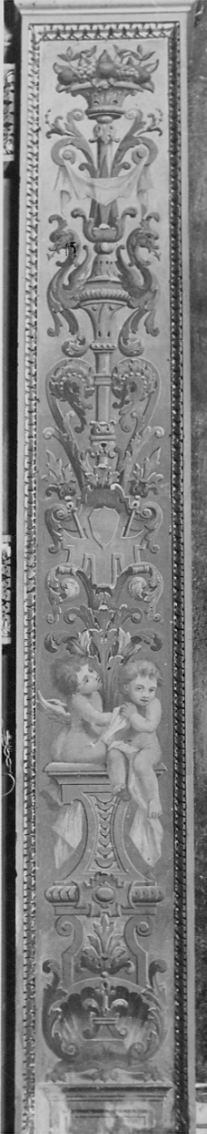 Su fondo oro è dipinta una decorazione a grottesche con foglie d'acanto in tinta azzurro, verde e violetto. Alla base due putti, uno dei quali alato