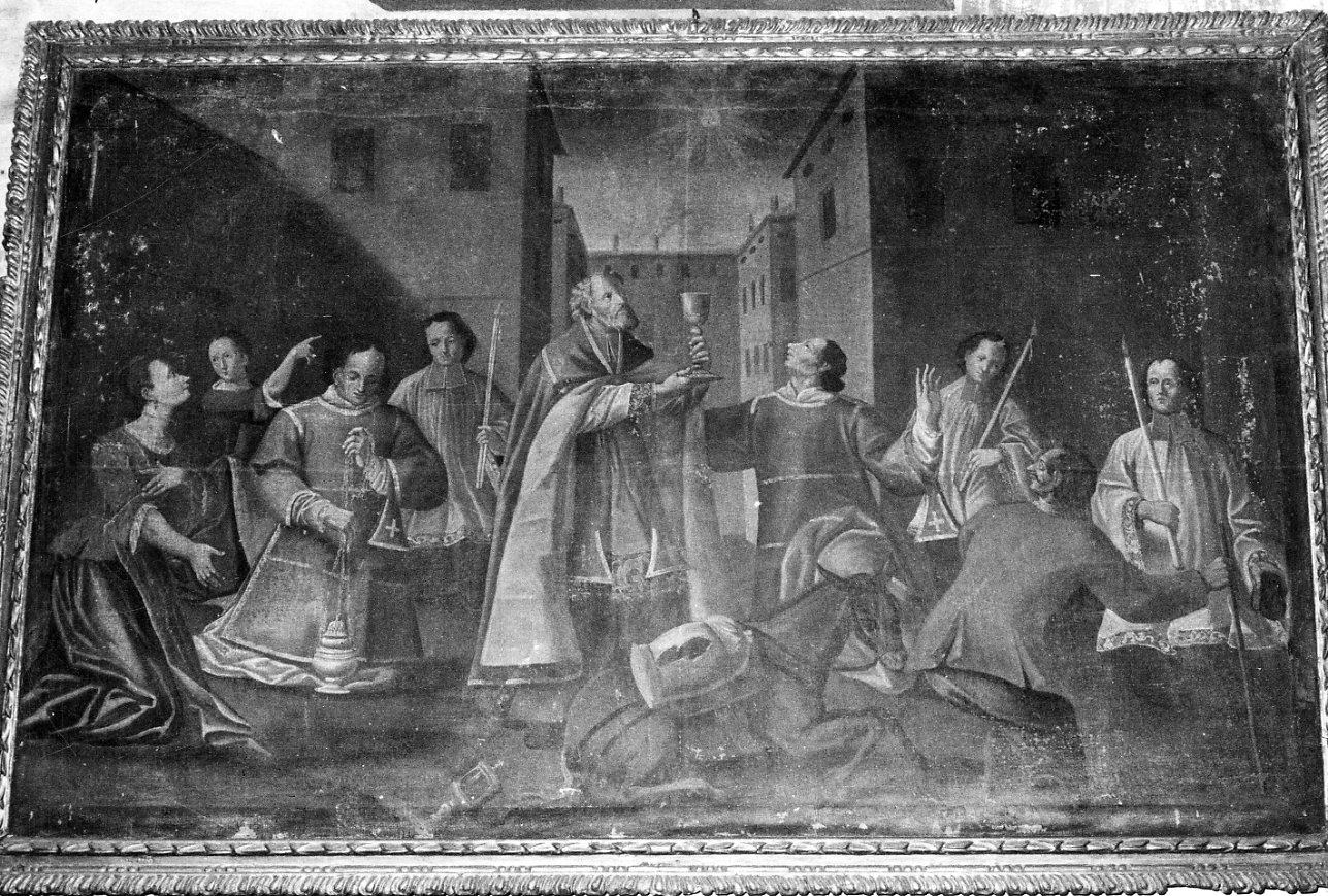 Al centro è raffigurato il vescovo che regge il calice; intorno, chierici, sacerdoti e due donne che commentano la scena. In primo pieno, il ladro che guida la mula inginocchiata a causa del fardello da cui cadono alcuni oggetti sacri. Sullo sfondo alcuni palazzi ed una via cittadina