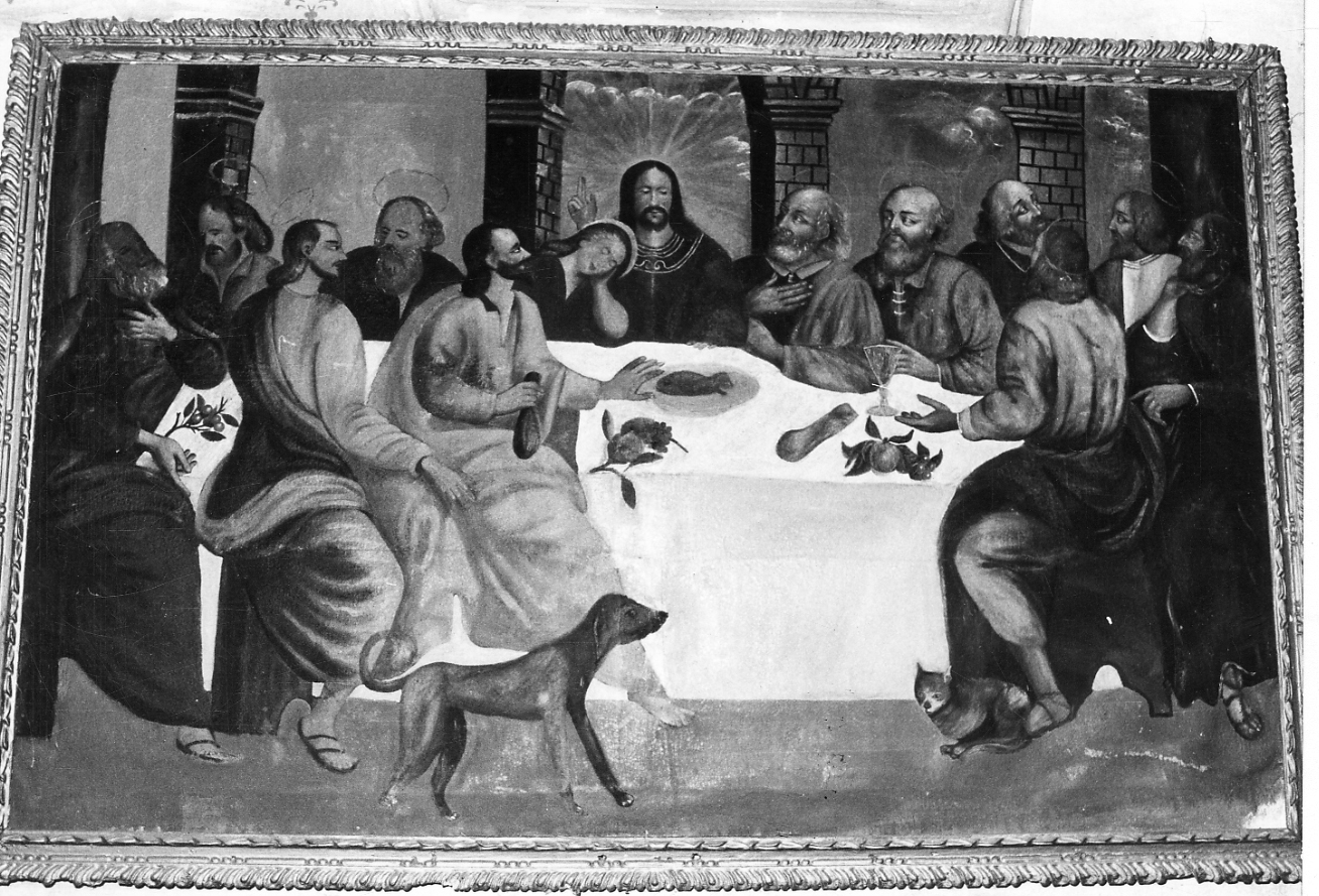 La tavola con Cristo ed i dodici apostoli occupa l'intera scena; sono raffigurati secondo l'iconografia tradizionale, attorno ad una tavola imbandita. In basso, sono raffigurati un cane ed un gatto. Tre arcate fanno da sfondo alla scena