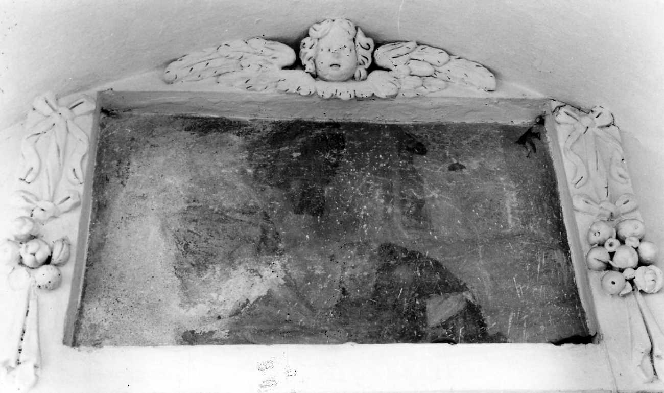 Stucchi posti ad incorniciare un affresco raffigurante probabilmente un frate prostrato in atteggiamento di preghiera. Si compongono di una testa di cherubino al centro nella parte superiore della cornice e di due festoni di nastri, uno per parte, ai quali sono annodati gruppi di frutti e terminanti a straccetto
