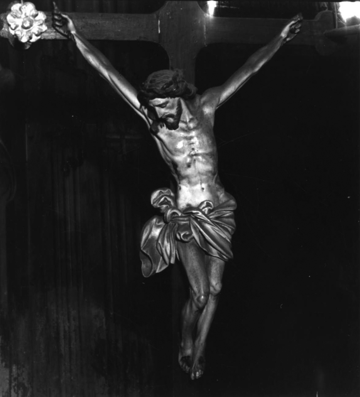 Croce processionale; sulla croce, munita di struttura metallica per reggere il velo, compaiono alle estremità delle braccia, due rosoni in legno dorato. Il Cristo reca come perizoma un ricco drappeggio annodato sul fianco; i piedi sono fissati con doppia chiodatura. Il capo è reclinato sulla destra