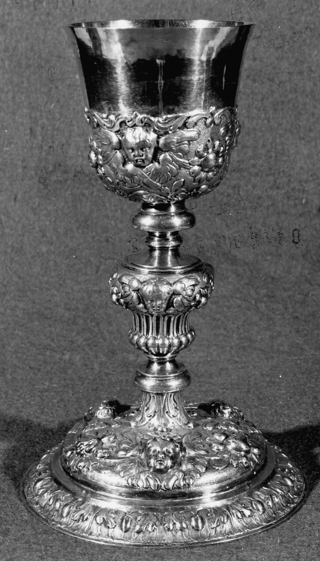 Calice lavorato a sbalzo e cesello. Sottocoppa con teste di cherubini tra fiori e cimasa a volute fitomorfe; nodo a tronco di piramide con teste di cherubino e ghirlande a nastro con fiore, scanalature verticali e baccellature. Nella base si ripetono le decorazioni a teste di cherubini tra nastri e fiori; foglie d'acanto e perline ornano l'ultima cornice del piede