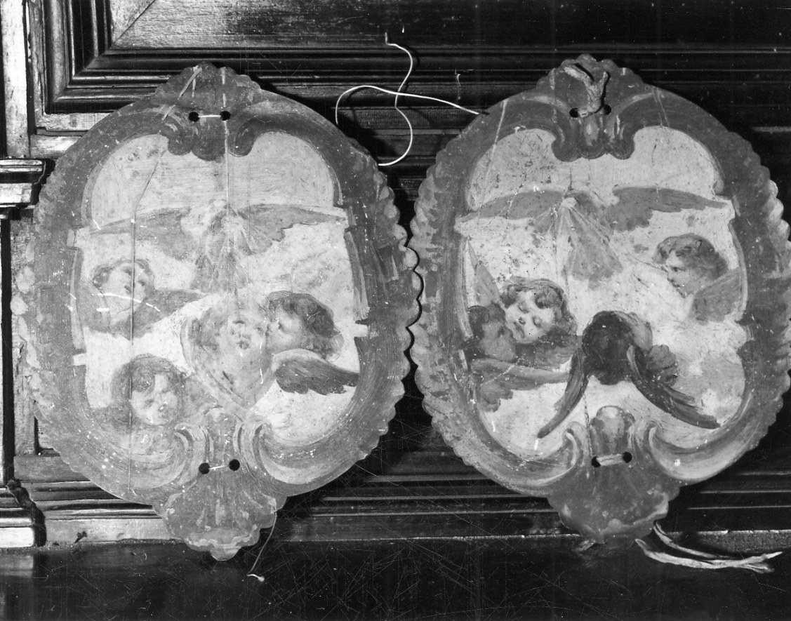Coppia di medaglioni ovali in metallo dipinto con bordo seghettato e perforato da due buchi per ciascuna estremità. Rappresentano entrambi lo stesso soggetto, ma la raffigurazione sul medaglione sinistro risulta stilisticamente effettuata con minor perizia. L'immagine è racchiusa in una cornice dipinta in bruno e giallo, con volute al centro, in alto ed in basso; la colomba dello Spirito Santo viene dipinta ad ali aperte e con la testa voltata a destra in un medaglione ed in un altro a sinistra. Sotto la colomba sono raffigurati i cherubini, con ali color celeste, rosso amaranto e grigio; hanno il volto roseo ed i capelli castani, bianchi e marroni