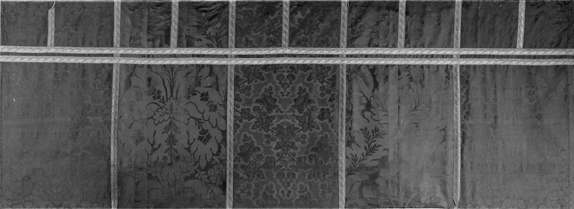 Paliotto in damasco di seta rossa, formato da pezzi di varie stoffe con disegno diverso, uno a disegni più minuti, l'altro più ampio, ambedue a colonna verticale con andamento a pigna costituito da rami fioriti che si dipartono da un nucleo centrale