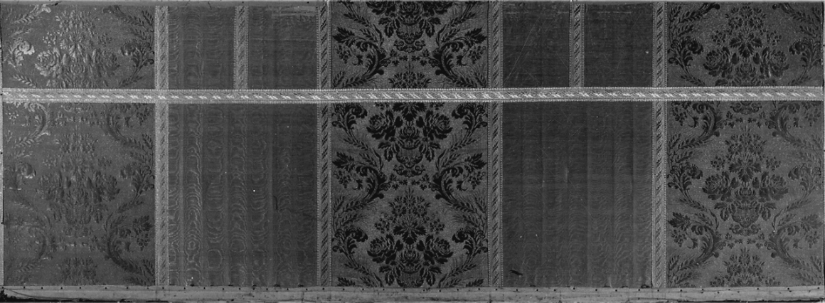 Paliotto a strisce di seta broccata d'oro alternate ad altre di seta marezzata di colore oro. Il disegno è a nastri di rose e foglie centrali disposte verticalmente, fiancheggiati da motivi ondeggianti di spighe, foglie, grappoli d'uva