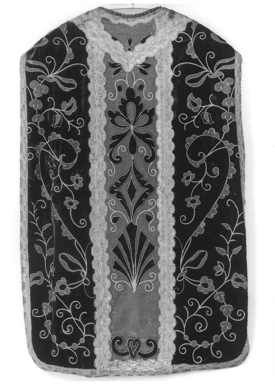 Paramento in velluto con applicazioni a ricamo formato da una pianete, una stola ed un paliotto