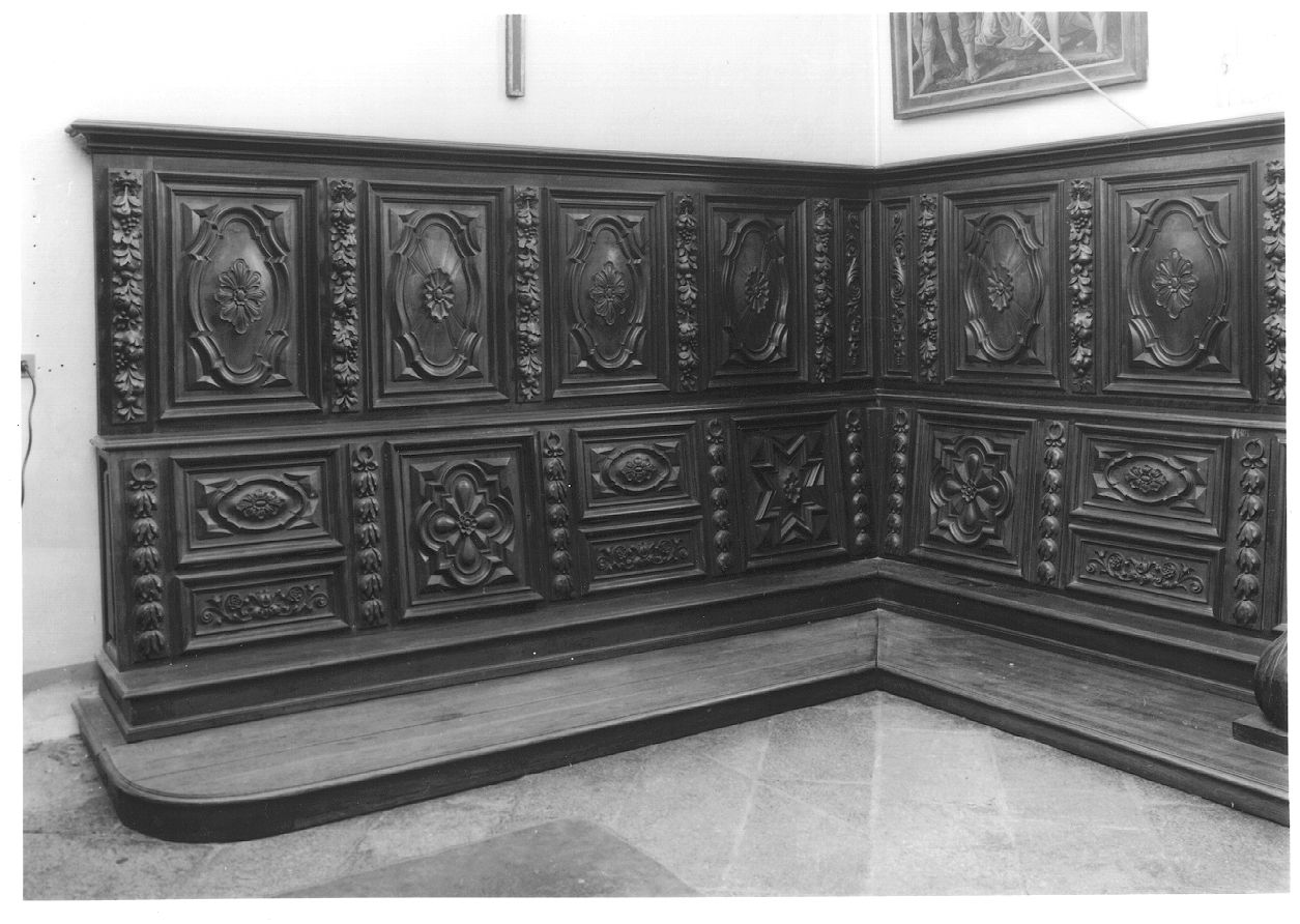 La boiserie consta di due corpi sovrapposti, con tredici pannelli intagliati a forte rilievo con motivi mistilinei, rosone al centro e pendenti con frutta e foglie che scandiscono la successione dei pannelli che nel corpo inferiore si aprono alternativamente a ribalta, formando inginocchiatoi, e a sportelli