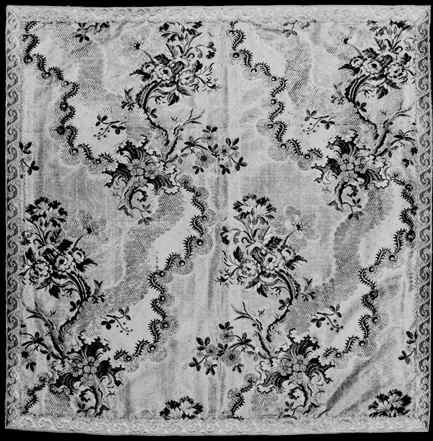 - NOTIZIE STORICO CRITICHE L'andamento fortemente sinuoso e parallelo dei nastri a pizzo, intrecciati con nastri ornati di motivi fortemente stilizzati come i brevi tralcetti con pois, e la disposizione e il gusto delle foglie e dei mazzi consigliano un'attribuzione del tessuto al secondo Settecento