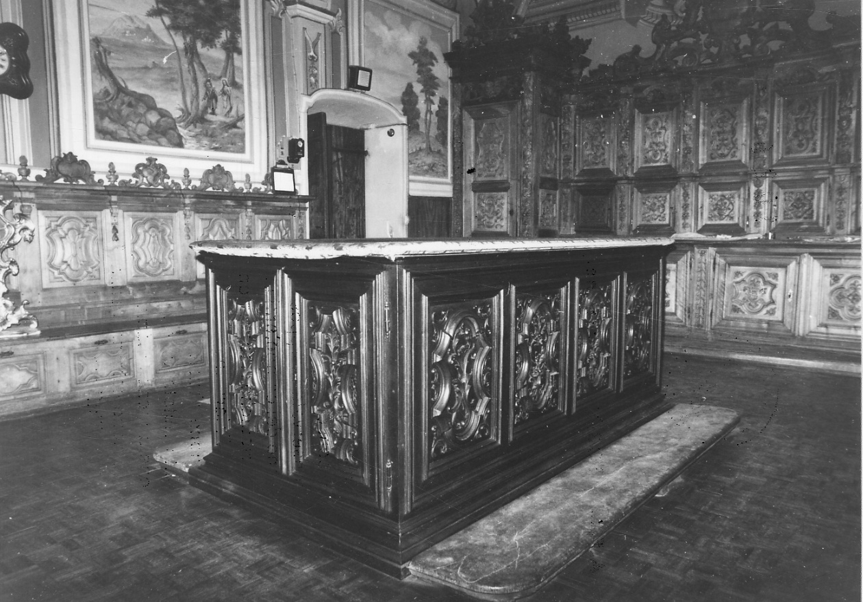 - NOTIZIE STORICO CRITICHE Nel capitolare del 24/1/1743 dell'archivio parrocchiale si legge che i mobili della sacrestia vennero eseguiti in quell'anno da Gaspare Serra, per cui anche questo cassone è da ritenersi opera sua, come confermano anche i dati stilistici; infatti nella simmetrica scompartizione si esprimono la libertà creativa dell'artista e la ricchezza dell'intaglio. Schedatura precedente: Pistoi M., 1969