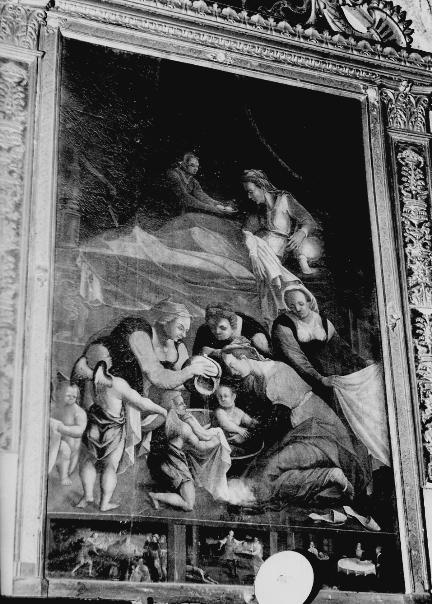 - NOTIZIE STORICO CRITICHE Non si possiedono specifiche notizie sulla storia dell'oggetto. Tuttavia, l'attenzione nella resa dei particolari relativi ad atti quotidiani, tale da far assumere alla scena un tono di calda intimità può far pensare ad un artista che si rifà a modelli manieristi di ambito settentrionale, in particolare cremonese. Un preciso riferimento è individuabile nel pittore Pompeo Secondiano di cui si conosce un'opera, datata al 1615 (U. Thieme-F. Becker) ed il cui stile è molto simile a quello del dipinto in esame, tanto da far pensare ad una possibile realizzazione da parte del pittore o ad una replica coeva. Per quanto riguarda la cornice, è da segnalare la scomparsa dei due putti modellati a tutto tondo che sorreggevano le lesene