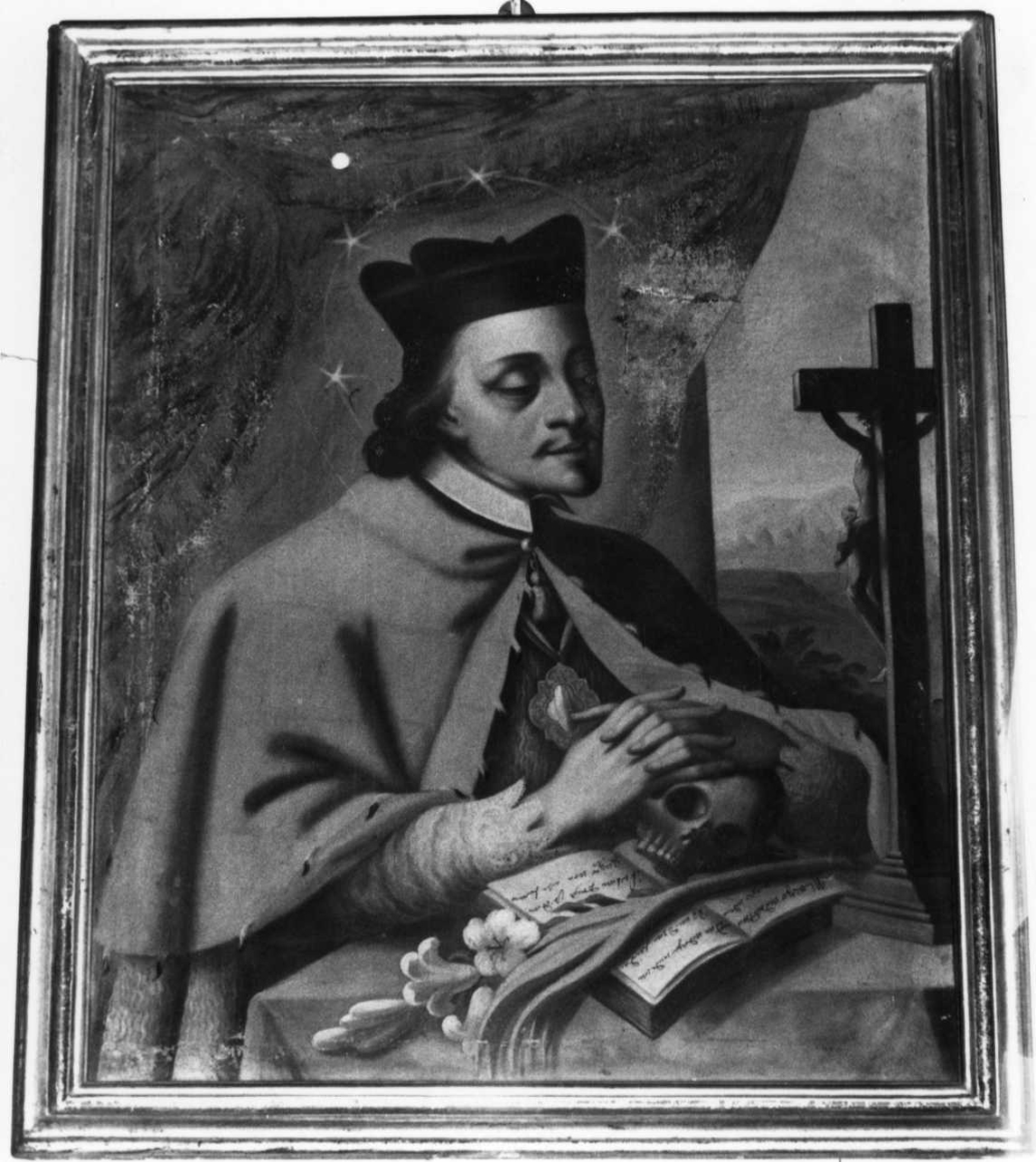 Il santo è raffigurato assorto in preghiera di fronte ad un crocifisso, con le mani giunte appoggiate su un teschio. Un drappo sollevato lascia scorgere sul fondo un paesaggio collinoso con chiome d'alberi, sullo sfondo vi sono delle montagne. Il volto e le mani sono rosa, la veste, il drappo e il manto del tavolo sono azzurri, la mantella è grigia, la palmetta nocciola, i gigli bianchi con lo stelo verde. Il crocifisso è giallo su croce marrone. La colonna e la campagna sono grige e nocciola e le montagne azzurre. La cornice presenta una decorazione a modanature