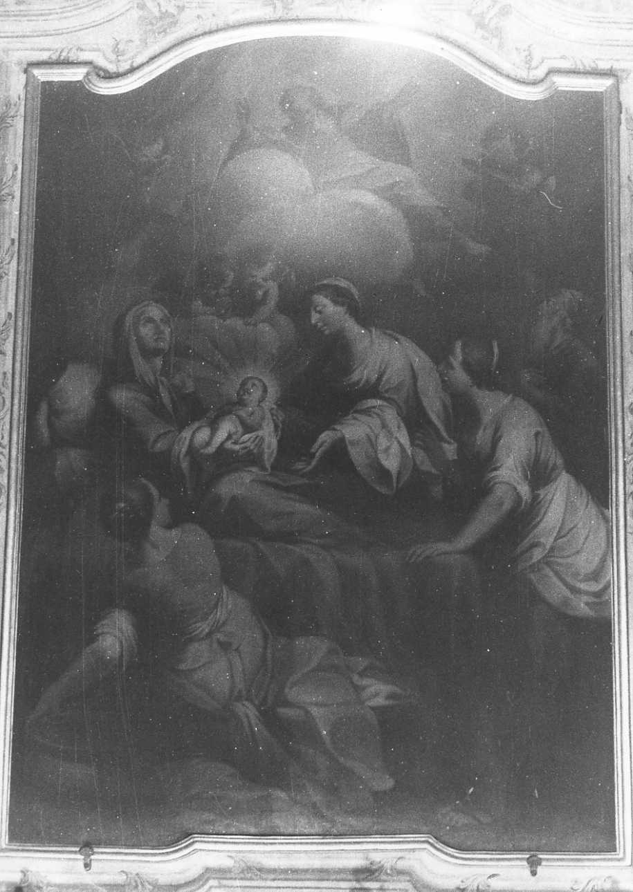 In alto Dio Padre appare in azzurro tra luci bianche-gialle e nubi attorniato da angeli. Al centro in ambiente scuro, grigio e marrone una donna in abiti grigi e blu presenta l'infante a Sant'Anna che giace in un letto con coperte gialle mentre un'altra donna in vesti azzurre e manto giallo assiste alla scena. Cornice lignea dorata