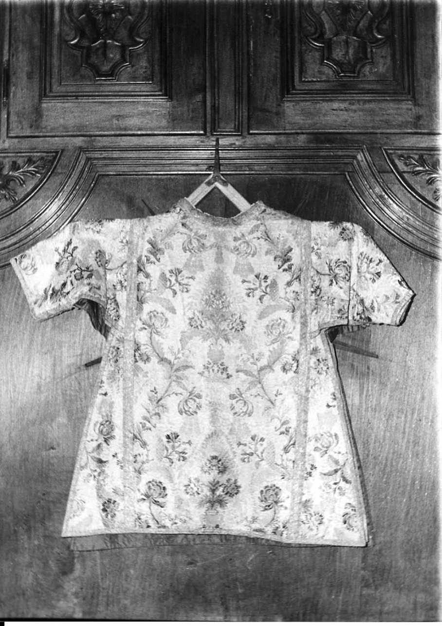 - NOTIZIE STORICO CRITICHE Queste due tunicelle, insieme a un piviale, conservato nella Chiesa, fanno parte di un paramentale proviente, come gli altri arredi sacri, dalla Chiesa dei S.S. Andrea ed Evasio in Carassone, e forse in loco fin dal lontano 1864, quando fu chiesto al Vescovo di Mondovì, e concesso, che l'Amministrazione Parrocchiale di Carassone "fosse in piena facoltà di trasportare nella chiesa parrocchiale tutti i paramenti e i vasi sacri di cui la Chiesa di S. Evasio non abbisognava" (Ordinati delle Venerande Compagnie della Parrocchia di Carassone- dell'anno 1848 al 1876-mese giugno giorno 15 1864- Archivio Chiesa Parrocchiale). Nell'"Inventario degli arredi sacri esistenti nella Chiesa di St. Ev.o" (vol.VI n°16), eseguito in data aprile-maggio 1832, è indicato un:"Ternario con piviale bianco, di broccato in oro a fiori, avente la fodera di seta verde e guarnito d'oro", che potrebbe riferirsi al paramentale in questione. Queste tunicelle con piviale presentano le stesse caratteristiche, nel tessuto, di una pianeta pubblicata da M.di Macco (in "Valle di Susa Arte e Storia dall'XI al XVIII sec." Catalogo, Torino 1977, p. 176, tav.T.S.10), in cui "L'impianto naturalistico, la vivacità dei toni, la scelta del motivo decorativo, consentono il riferimento ad un centro di produzione come quello di Lione, in un momento in cui comincia ad essere accennato il motivo "a meandri". Anche questo paramentale è quindi da ascrivere alla Manifattura Francese, forse di Lione, e databile nella prima metà del secolo XVIII