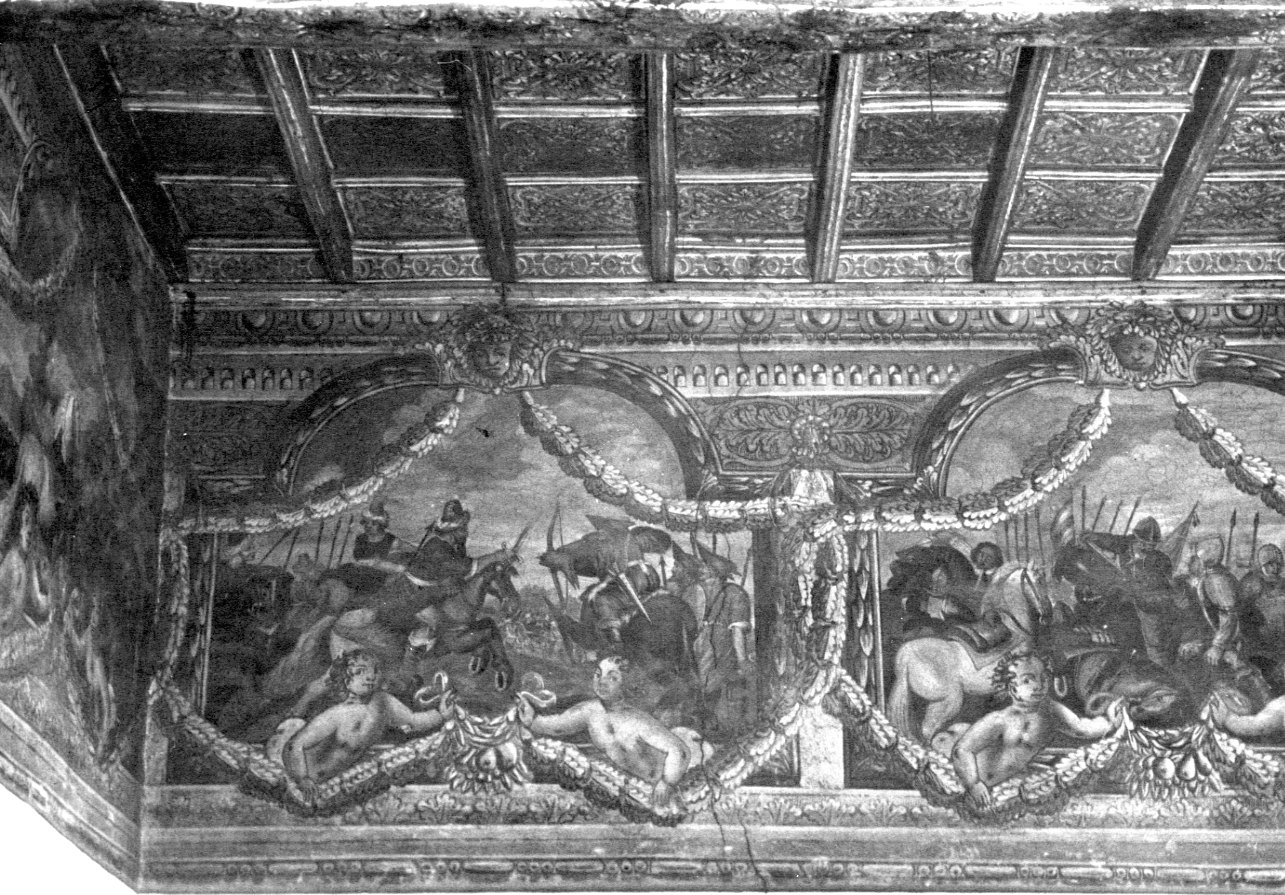 Nel primo riquadro due cavalieri combattono con arco e pistola; portano copricapo a turbante e a cappello indicanti probabilmente l'appartenenza a due eserciti nemici: quello spagnolo e quello francese. I riquadri sono separati da ghirlande di foglie non più rotte dai putti-cariatide, essendo le pareti Est e Ovest più brevi di quelle Nord e Sud