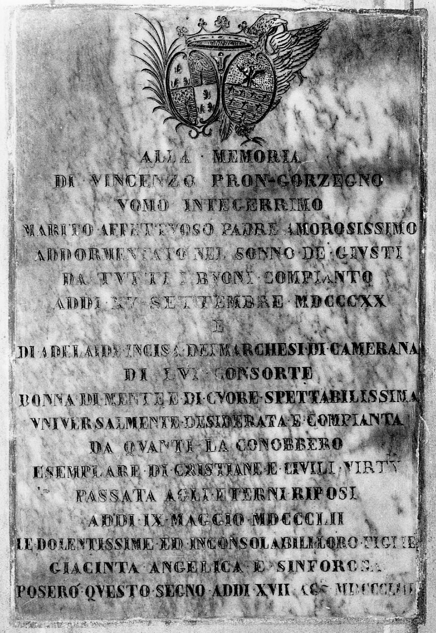- ISCRIZIONI sul recto - ALLA MEMOORIA/ DI VINCENZO PRON GORZEGNO/ UOMO INTEGERRIMO/ MARITO AFFETTUOSO PADRE AMOROSISSIMO/ ADDORMENTATO NEL SONNO DEI GIUSTI/ DA TUTTI I BUONI COMPIANTO/ ADDIXV SETTEMBRE MDCCCXX/ E/ DI ADELAIDE INCISA DEI MARCHESI DI CAMERANA/ DI LUI CONSORTE/ DONNA DI MENTE E DI CUORE SPETTABILISSIMA/ UNIVERSALMENTE DESIDERATA E COMPIANTA/ DA QUANTI LA CONOBBERO/ ESEMPLARE DI CRISTIANE E CIVILI VIRTU'/ PASSATA AGLI ETERNI RIPOSI/ ADDI IX MAGGIO MDCCCLII/ LE DOLENTISSIME ED INCONSOLABILI LORO FIGLIE/ GIACINTA ANGELICA E SINFOROSA/ POSERO QUESTO SEGNO ADDI XVII AGO.MDCCCLIII - lettere capitali -