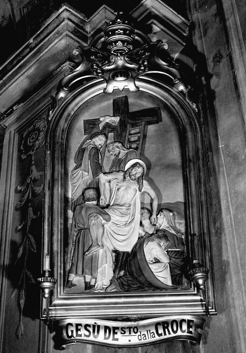 Al centro è raffigurata la croce, sulla quale sono ancora appoggiate le scale a pioli, sulle quali sono raffiguarti due uomini che stanno depositando il corpo del Redentore. Le gambe deòl Cristo sono trattenute da un terzo uomo, mentre a destra sono inginocchiate la Maddalena, la Madonna ed una terza donna. Sullo sfondo alcune montagne