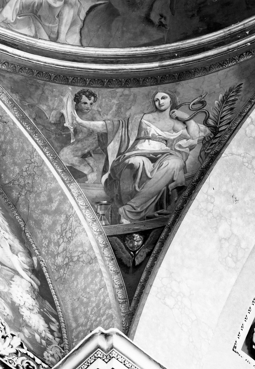 La Prudenza, vestita in rosa e rosso, nell'atto di rimirarsi in uno specchio rettole da un puttino, tiene in mano un serpente ed ha accanto una clessidra