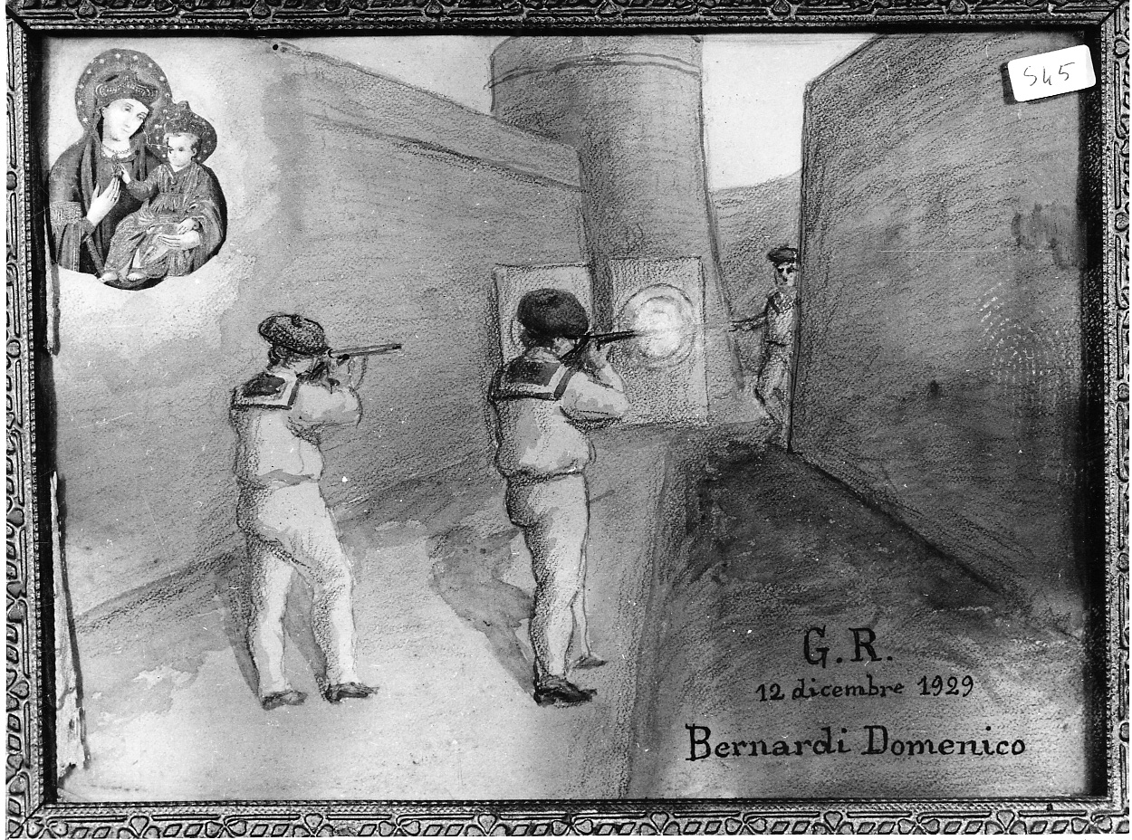 • NOTIZIE STORICO CRITICHE L'ex voto è stato offerto da Bernardi Domenico di Giaveno, 21 anni, cannoniere della Regia Marina. Il 12 dicembre, mentre si trovava a Brione (Pola) intento a segnare i punti riportati dai commilitoni nei tiri a segno trimestrali, fu colpito all'addome da un proiettile di rimbalzo. Trasportato all'ospedale marittimo di Pola e sottoposto a visita radioscopica si constatò la presenza del proiettile nel lato destro inferiore della cassa toracica, al di sospra del fegato. La prognosi è riservata; il paziente ricorre all'aiuto della Consolata e migliora così rapidamente che dopo soli 16 giorni di degenza può uscire dall'ospedale, senza che il proiettile venga asportato. Riconoscente per la grazia ricevuta, il 5 gennaio, durante la licenza per convalescenza, si reca alla Consolata per ringraziare la Madonna con la celebrazione della messa; inoltre riferisce in sagrestia la grazia e si riserva di portare un quadro (Cronaca mensile del Santuario, in La Consolata, a.II (1927), n.2, pp.27-28). Il quadro è molto simile ad altri che si conservano nel Santuario e cioè: ALS5, A25, A26, A43, A38, A22, A23, A48, BLS2, BLS3, BLS4, BLS7, BLD7, BLD4, N40, N66, N64, N7, CLS2, C42, CLD1, CLD2, CLD5, CLD3, E1, E8, E9, E28, E15, E29, E16, E33, E37, E27, E21, E7, E14, D11, D18, D38, D13, D6, DLD6, DLD4, DLD5, DLD8, DLS2, DLS3, DLS5, DLS6, I41, GLD1, GLD2, GLD3, GLD4, GLD6, FLS2, FLS3, FLS4, FLS5, FLD3, FLD2, F1, F3, F10, F26, F17, F16, F30, F34, F35, F36, F32, F27, F20, F21, F13, F5, F7. (BORELLO L., Gli ex voto della Consolata. Storie di grazia e devozione nel Santuario torinese, Torino 1982, p.138)