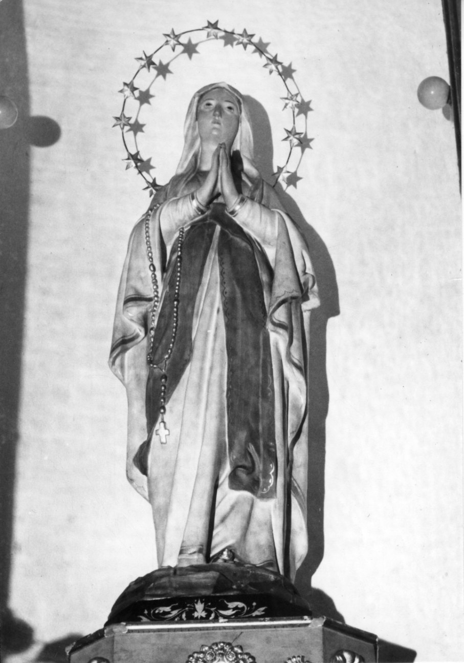 - NOTIZIE STORICO CRITICHE L'apparizine della Madonna a Lourdes avvenne nel 1858 e la prima statua, alla quale si ricollegano le iconografie successive, risale al 1864. La statua in questione, di scarso valore artistico, può forse datarsi alla fine dell'Ottocento. Il culto verso la Madonna di Lourdes è assai diffuso e statue simili a questa sono riscontrabili in moltissime chiese