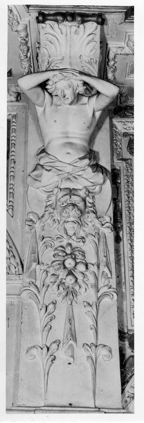 Il telamone in stucco bianco, sotto una mensola con foglie di acanto, regge una parte del coro e tiene entrambe le mani sul capo. Un panno dalle pieghe spezzettate si appoggia a un grande disco tondo che fa da sfondo a una maschera leonina, reggente tra la bocca una caduta di frutti legati a un nastro che scende fino al termine del pilastro. Ai lati due palmette stilizzate si mescolano a due drappi annodati
