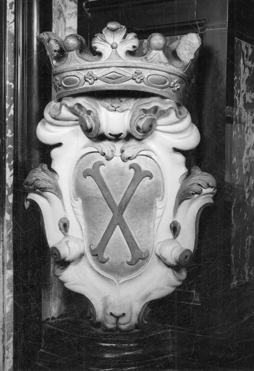 - NOTIZIE STORICO CRITICHE Lo stemma dei Padri Filippini è stato eseguito approssimativamente poco dopo la metà del secolo XVIII e collocato ai lati dell'altare maggiore. Il lavoro di scultura e di intaglio del legno presenta notevoli aspetti qualitativi, che si rilevano nella rifinitura della corona e nei motivi vegetali dorati. L'opera pertanto è assegnabile all'ambito di un'elevata bottega di intagliatori, attiva nel territorio torinese. La ridipintura più moderna ne attenua la qualità