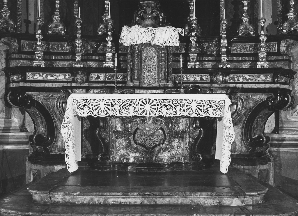 Tre gradini in marmo venato di rosa (moderni) sorreggono un complesso ad ampie volute laterali, con inserita lateralmente una larga foglia gialla e sottolineata sul davanti da ghirlande contrastanti. Sopraelevature a tre gradini, sottolineati da cornici in marmo nero, nella tonalità del rosso, bianco, giallo e grigio. Nel primo e nell'ultimo piccola ghirlanda, in tono contrastante, ai lati del tabernacolo. Il paliotto, anch'esso ad ampie volute, presenta un motivo centrale con elementi vegetali, sormontato da una conchiglia in marmi neri e gialli. Sul tabernacolo un tronetto a volute che riprende il motivo del paliotto con strozzatura centrale e concluso da una mensola, anch'essa in marmo nero