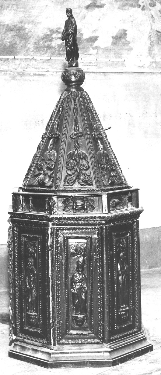 - NOTIZIE STORICO CRITICHE Non si possiedono notizie sulla storia dell'oggetto, ad eccezione di una presunta data di costruzione, riportata per tradizione orale al 1680, della quale però non si è trovata traccia nè sull'opera, nè tra le carte dell'archivio. La scarsità di documentazione permette solo un confronto stilistico atto a chiarire maggiormente l'ambito culturale in cui questo oggetto fu prodotto. Alcuni elementi nella resa dell'intaglio e nell'impostazione generale lo avvicinano sostanzialmente alla produzione dei legnamari biellesi (si veda ad esempio la ricchezza degli elementi vegetali impiegati, la resa della figura, i sottili pannelli tendenti al verticalismo), dominatori assoluti sulla scena della scultura lignea di arredi sacri per tutto il XVII secolo. Un altro riferimento particolarmente significativo, anche se di ambito culturale lombardo, ma che tuttavia presenta con l'oggetto in questione notevoli affinità, è quello con un progetto disegnato a penna per il battistero della Collegiata di Arona e datato al 1677, caratterizzato da elementi della struttura a tempietto, dalla fonte con piede a bulbo, dall'interpretazione degli ordini (Arona Sacra, Torino 1977, p. 126). Notevole interesse rivela anche la presenza di iconografia di santi tipicamente vercellesi. E' da segnalare ancora il pessimo stato di conservazione, dovuto probabilmente ai frequenti spostamenti (dalla chiesa precedente, alla cappella del Sacro cuore, alla collocazione odierna), e la sua precaria collocazione attuale. L'oggetto è posto nel locale tra il primo e il secondo altare, nella navata sinistra