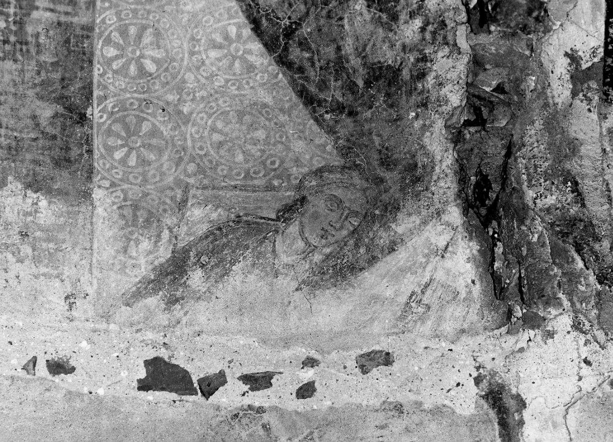 Il frammento di decorazione absidale raffigura il volto di una figura femminile con velo di colore scurto, il bordo esterno di colorfe verdastro della mandorla iridata e alcuni frammenti di decorazione geometrica di colore giallo-grigio