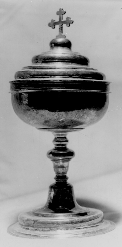- NOTIZIE STORICO CRITICHE La pisside provenie da Palazzo Mazzola, già sede dell'O. P. "Buon Pastore", chiuso nel 1979, ed ora sede dell'Archivio Storico Comunale, e potrebbe essere in quella menzionata in un inventario patrimoniale dell'O. P., datato 1888, ora conservato nell'Archivio Storico Comunale. La diffusione della tipologia ornamentale rende assai complesso lo studio dell'opera, databile alla prima metà del XIX secolo. Il punzone non è fra quelli pubblicati da A. BARGONI, Maestri orafi e argentieri in Piemonte dal XVII al XIX secolo, Torino 1976