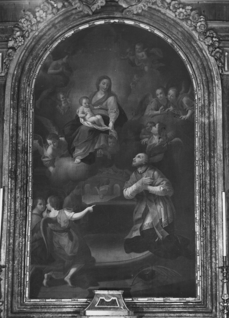 - NOTIZIE STORICO CRITICHE Tra i decreti della Congregazione si legge, in data 1792, al 22 febbraio, si legge che il S. Maggia e S. Massimino si recarono a Torino per ringraziare S. Maestà il Re e la Regina per il quadro dell'Altare Maggiore, per quello rappresentante il Cuore di Gesù e S. Teresa, ora al Cottolengo, e per i 69 carri di marmo inviati e che nel frattempo riuscirono a farsi promettere una Statua della Vergine Addolorata e "procurato che i due Principi Reali Duca d'Aosta e Duca di Monferrato facessero i quadri degli altri due altari minori, cioè quello di S. Francesco di Sales con insieme S. Carlo e quello di S. Giovanni Nepomuceno" (Biella, Archivio Oratorio S. Filippo Libro II dei Decreti dei Deputati della Congregazione dal 1751 al 1800, al 22 febbraio 1797) Il secondo quadro non venne inviato ed infatti tre anni dopo si annotava: "1800, marzo; siccome le circostanze attuali non portano più alcuna possibilità che quegli dei Reali Principi, che si era obbligato grandiosamente a far fare il quadro di S. G. Nepomuceno, sia in caso di farlo fare, nè tanto meno avendo la Congregazione in caso di fare tale spesa, si è pensato dai Deputati di far solamente copiare in grande un abozzetto, che ha il P. Righini di Torino dal S. Lace di Andorno assai abile per tal sorta di lavori, il quale si contenta di lire duecentocinquanta in moneta (non in Biglietti) oltre poi una mancia. Quanto alla mancia fu espresso dal contratto che non vi sarebbe obbligazione alcuna. A proposizine della riuscita e per tal pagamento si sono applicate le L. 1121 (?) offerte da persona divota per un quadro della Vergine (in d.abbozzetto vi è la B. V. e S. G. Nepomuceno), L. 150 in biglietti che ridotti in monete vaglino solo L. 85,5, offerte dal S. Tua e qualche altra oblazione". Il dipinto si rifà a modelli settecenteschi ed in particolare a quelli di Sebastiano Conca (Sebastiano Conca (1680-1764), catalogo della mostra, Gaeta 1981); sul pittore, figlio di Giovanni Antonio Lace e suoi lavori, documentati dal 1787 al 1827, si veda C. CARAMELLINO, in Dizinario enciclopedico Bolaffi dei pittori e incisori italiani, Torino 1974, v. VI, pp. 228-229