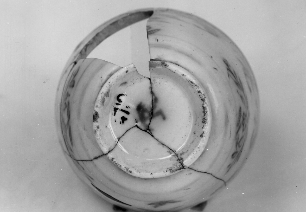 - NOTIZIE STORICO CRITICHE Oggetto proveniente dallo scavo condotto da Alfredo D'Andrade nei sotterranei di Palazzo Madama nel 1884 in occasione del quale si rinvenne una cospicua quantità di materiale ceramico in un vano quadrangolare attiguo alla torre di Nord-Ovest. Inventariata insieme al complesso degli oggetti provenienti dallo scavo viene così indicata: " ... le maioliche (sono) del XVI-XVII secolo (una tazza della fabbrica Rossetti)". Non v'è dubbio invece che sia porcellana. Forse proprio a causa della sua collocazione tra le maioliche è rimasta ignorata anche da parte di Viale che per primo identificò due esempi di porcellana Rossetti, due piccoli busti, nelle collezioni del museo civico (V. VIALE, Porcellane della fabbrica Rossetti di Torino in Faenza, 4-6, p. 118). La tazzina presenta le stesse caratteristiche rilevate dal Viale nei due busti, cioè di pasta dura, trasparente, leggera, bianca leggermente bluastra con aspetto lucido vetroso. La decorazione in azzurro a sottili motivi vegetali non è ben netta, quindi accentua l'aspetto di colore sfumato a tutta la superficie; forse proprio questo aspetto era stato rilevato dai periti quando nel 1743 i campioni delle porcellane Rossetti furono presentati al Consolato del Commercio per ottenere il rinnovo delle patenti ottenute nel 1737, cioè un "piccolo divario nella bianchezza e pittura" nei confronti della porcellana cinese (cfr. G. MORAZZONI, Le porcellane italiane, Milano-Roma, 1935, p. 195). Si veda M. CORTELAZZO, L. MURER, G. PANTO', L. VASCHETTI, S. PETTENATI, La ceramica di scavo in Palazzo Madama in AA. VV., Torino nel basso medioevo: castello, uomini, oggetti, catalogo della mostra, Torino, 1982, p. 268, n. 178