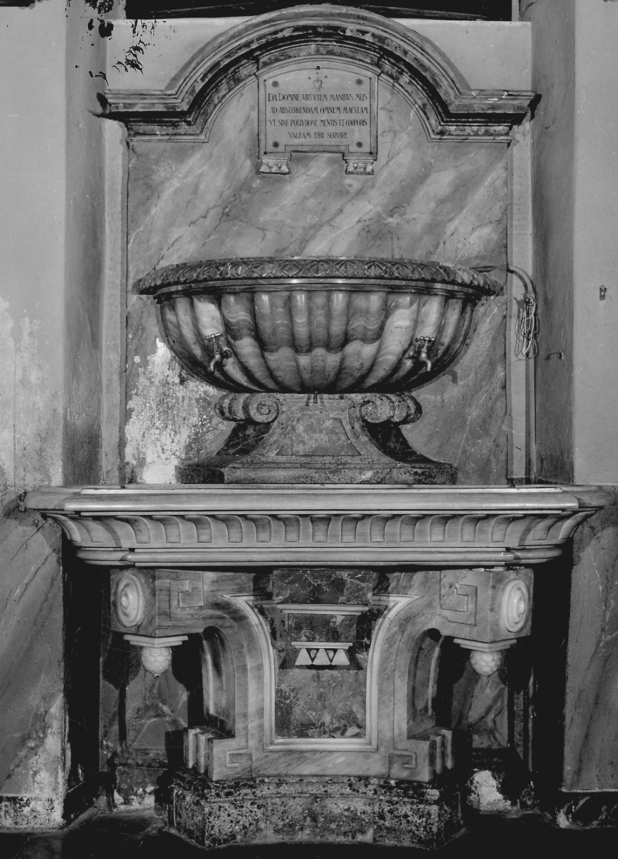 - NOTIZIE STORICO CRITICHE Il lavabo presenta un partito decorativo affine a quello degli altri arredi della Chiesa, essendo stata realizzata anche la sacrestia su disegno, con qualche variante, dell'architetto Carlo Ceroni (cfr. voce relativa di M. Di Macco in "Dizionario biografico degli italiani", Roma 1979, v. XXIII). Nel "Prefetto della fabbrica dal 1817", all'anno 1834 è annotata una spesa di L. 17.00 "ai marmorini per aggiustare il lavandino del Refettorio e della Sacrestia"