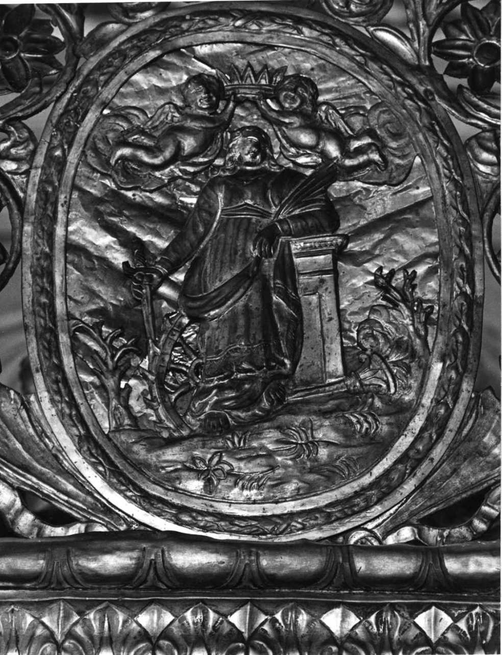 Entro un medaglione con cornice creata da foglie d'alloro, si staglia la Santa, con un gomito appoggiato su un basamento, abbigliata con un'ampia veste stretta in vita da un'alta cintura. Se colla destra trattiene la pama del martirio, colla sinistra stringe la spada, la cui punta è celata dalla ruota dentata posta a sinistra, ai piedi della figura femminile. Due putti alati stanno adagiando una coronna sul capo della giovane donna. La scena è ambientata in un paesaggio definito dapiante stilizzate e ciuffetti d'erba