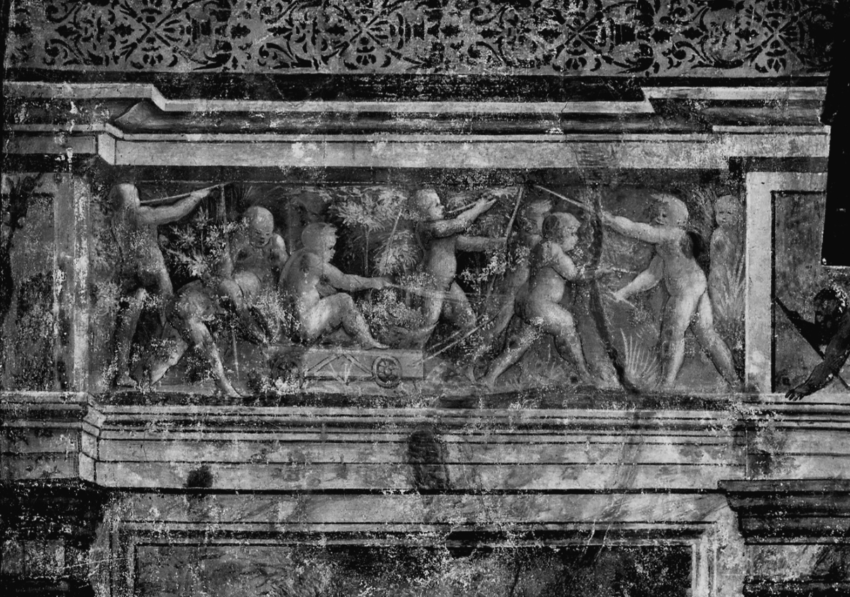 - NOTIZIE STORICO CRITICHE Lo schema compositivo articolato entro elementi architettonici riflette lo stesso gusto già riscontrato in altri ambienti dell'edificio, come si ripete, con soggetto diverso, il tipo del fregio monocromo sui toni del grigio ad imitazione del bassorilievo, già visto nel salone di rappresentanza di questo stesso edificio. Qui è anche più evidente la derivazione da originali scultorei romani, secondo quel costume diffusosi nell'arte italiana del Quattrocento e inziato in Lombardia con la presenza di Bramante, prima che la scoperta della Domus Aurea sostituisse con la grottesca questo tipo di decorazione (cfr. C. Acidini Luchinat, La grottesca, in Storia dell'Arte Italiana, Torino, 1982, p. III, vol. IV, pp. 161 e segg.). Bibliografia generale di riferimento per il ciclo di affreschi di casa Alciati: P. G. Stroppa, Archivio della Società Vercellese di storia e arte, Vercelli, 1912, vol. II, p. 531; V. Viale, Guida ai Musei di Vercelli, Vercelli, 1935, pp. 19-21, tavv. I-IV; A. M. Brizio, Vercelli, Roma, 1935, pp. 163-164; P. Verzone, Il restauro della casa Alciati in Vercelli, Vercelli, 1936, p. 16; V. Viale, Vercelli e la sua provincia dalla romanità al fascismo, Vercelli, 1939, pp. 3-5; L. Mallé, Le arti figurative in Piemonte, Torino, 1961, pp. 180-181; G. C. Faccio-G. Chicco-F. Vola, Vecchia Vercelli, Vercelli, 1961, pp. 128-129; P. Astrua-G. Romano, Guida breve al patrimonio artistico delle provincie piemontesi, Torino, 1979, p. 100. Gli affreschi, insieme a quelli che decorano gli altri otto ambienti di casa Alciati, furono restaurati negli anni 1933-1934 in seguito al ripristino delle strutture architettoniche dell'edificio, condotto dall'ing. Paolo Verzone a partire dal 1930. Non è stato possibile rintracciare i dati relativi al restauro pittorico, eseguito dall'impresa del comm. Cussetti di Torino. Del lavoro eseguito resta solo notizia nei cenni che il Verzone riserva a questo problema: "...Le parti mancanti non furono naturalmente rifatte, ma solo abbozzate schematicamente a tinte chiare, in modo che la differenza tra la parte originale e quella aggiunta fosse ben evidente" (cfr. P. Verzone, Il restauro della casa Alciati in Vercelli, Vercelli, 1936, p. 16). Presso il Museo Civico di Torino si conserva la foto n. 353/9456