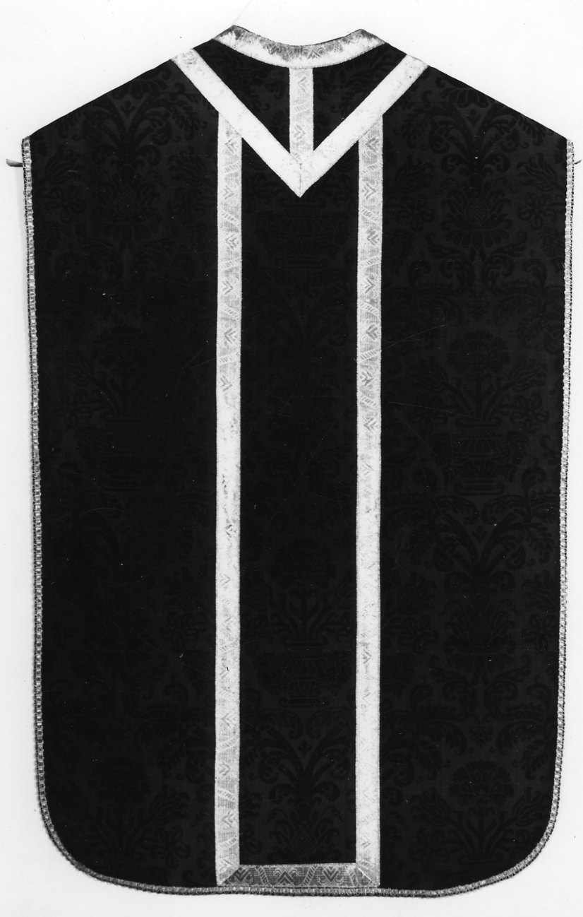 Il parato, a fondo verde, è composto di una pianeta, un manipolo e una stola. Il motivo decorativo è definito da tralci di foglie d'acanto uniti in maglie ovali a doppia punta, poste a scacchiera, e raccordate da un motivo a pigna. All'interno di ogni maglia campeggia un vaso baccellato, con erme poste di profilo, da cui escono: un garofano, due tulipani e due campanule, sistemati in rigida simmetria. Damasco raso a fondo verde. R.d.d. 50x n.r. Orditi: uno di fondo in seta viola-bluastro, 100 fili/cm. Trame: una trama di fondo in seta verde, 27 colpi/cm. Descrizione tecnica: il damasco è prodotto dall'accostamento della faccia-ordito, utilizzato per il motivo decorativo, e della faccia-trama per il fondo, di una medesima armatura, un raso da 5. Galloni: i galloni dello scollo e della fascia centrale (cm. 3) presentano un motivo a nastro alternato ad una foglia stilizzata, e sono eseguiti al telaio. I galloni che bordano esternamente le fasce laterali sono a fettuccia (cm. 1) e sono eseguiti al telaio. Entrambi i galloni sono in argento filato con anima di seta avorio e filo di seta avorio. Fodera: tela di lino verde-azzurro tinta a pezza e cerata