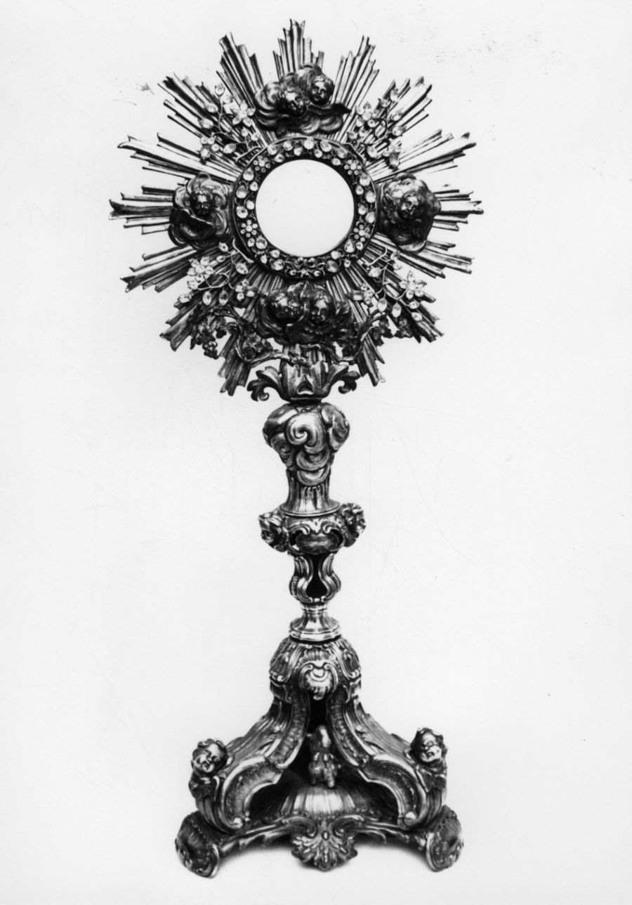 - NOTIZIE STORICO CRITICHE Il marchio di contro assaggio è quello di Giovanni Battista Carron, assaggiatore dal 1753 al 1778 (cfr. A. Bargoni, Mastri orafi e argentieri in Piemonte dal XVII al XIX secolo, Torino, 1976, p. 85, C-60); quello di assaggio è invece da riconoscersi come quello di Bartolomeo Pagliani, assaggiatore dal 1753/54 al 1775 (cfr. Ibidem, p. 190, P-3), per cui l'esecuzione dell'ostensorio si colloca tra il 1753 e il 1775. Il raffinato repertorio decorativo rococò, i putti e le nuvole morbidamente modellati, la qualità dello sbalzo e del cesello, indurrebbero però a restringere tale arco di tempo preferibilmente verso la metà del secolo e comunque non oltre la fine degli anni '60. L'oggetto è, con molta probabilità, da identificarsi con quello comprato dalla Confraternita nel 1768, come risulta dal registro dei conti di sacrestia dal 1783 al 1790, dove alla data 7 settembre 1786 è segnata una spesa di L. 291 per aver "Accomprato all'Incanto del Sig. March. Meana un raggio con granate false in peso onc. 48". Nuova menzione di esso si trova ancora nell'Inventario della Compagnia del SS. Sacramento e Dottrina Cristiana del 1842, dove è così descritto: "Raggio d'argento per l'esposizione del SS. Sacto guernito di pietre false colla sua custodia". Che quest'ultima citazione si riferisca proprio all'ostensorio in esame e non a quello, pure ornato di pietre e posteriore al 1824, pare confermato dalla notazione: "N: 18- vedi l'antico inventario" segnata a margine della descrizione. Quest'ultimo, che era contenuto nell'antico Libro della Compagnia, non è stato, almeno per ora, ritrovato