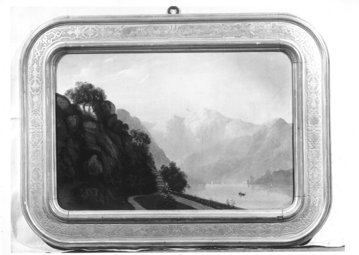 Dipinto rettangolare ad olio su tela; a sinistra una massa bruna montuosa, con stradina e scalinata; a destra lago con imbarcazioni. Cornice in legno intagliato e dorato smussata negli angoli