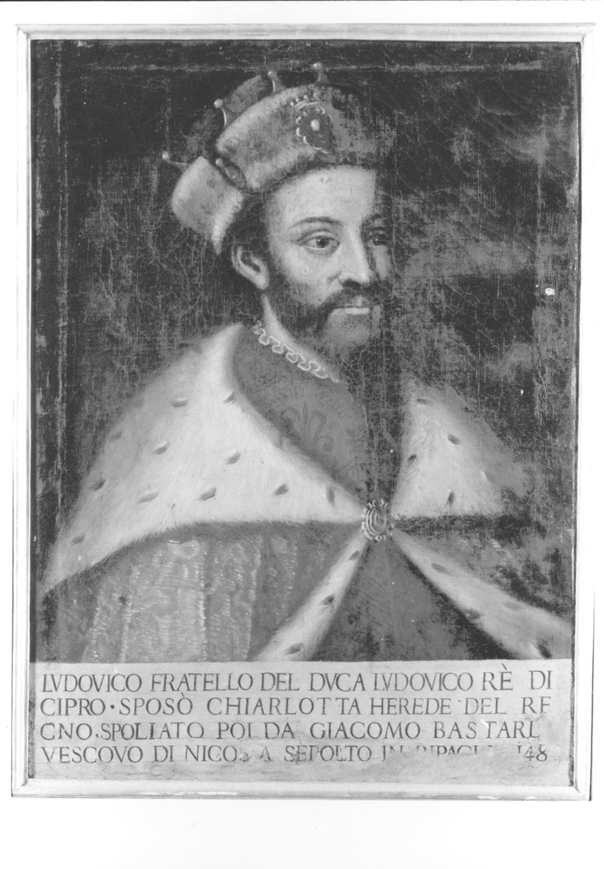 - NOTIZIE STORICO CRITICHE Nel castello di Agliè si conservano alcuni ritratti facenti parte di una serie dedicata agli antenati di Casa Savoia, documentata già nell'inventario del 1776 (in ASTO, Archivio Duca di Genova, Tenimento di Agliè, m. n. 50); allo stato attuale si tratta di una collezione di modeste dimensioni ma in passato contava centinaia di dipinti, di qualità e mani diverse. Nel corso dei secoli la serie fu incrementata ed in epoca ottocentesca resa omogenea attraverso alcuni interventi di ritocco delle pitture, di adeguamento di formato e di aggiunta o modifica delle iscrizioni presenti nella parte inferiore. Spesso tali interventi compromettono la lettura dell'effigie originaria e pongono notevoli problemi di datazione delle opere, che riflettono solo più la fase ottocentesca, e soltanto dopo un attento restauro si potrà definire con maggiore precisione l'epoca di esecuzione. Allo stato attuale si propone una datazione al XVII secolo, che tenga conto però dei forti rimaneggiamenti subiti dalle opere, anche se non si esclude che alcune possano essere soltanto copie ottocentesche di ritratti andati dispersi. La catena inventariale purtroppo è imprecisa poichè spesso le identificazioni proposte nei registri storici sono generiche e si riferiscono a gruppi di opere omogenee per soggetti. Il dipinto in esame ritrae Ludovico di Savoia (1437-1482, che sposò nel 1458 Carlotta di Lusignano. A differenza di quanto si legge nell'iscrizione, la consultazione delle tavole genealogiche indica che fu il figlio del duca Ludovico e non il fratello