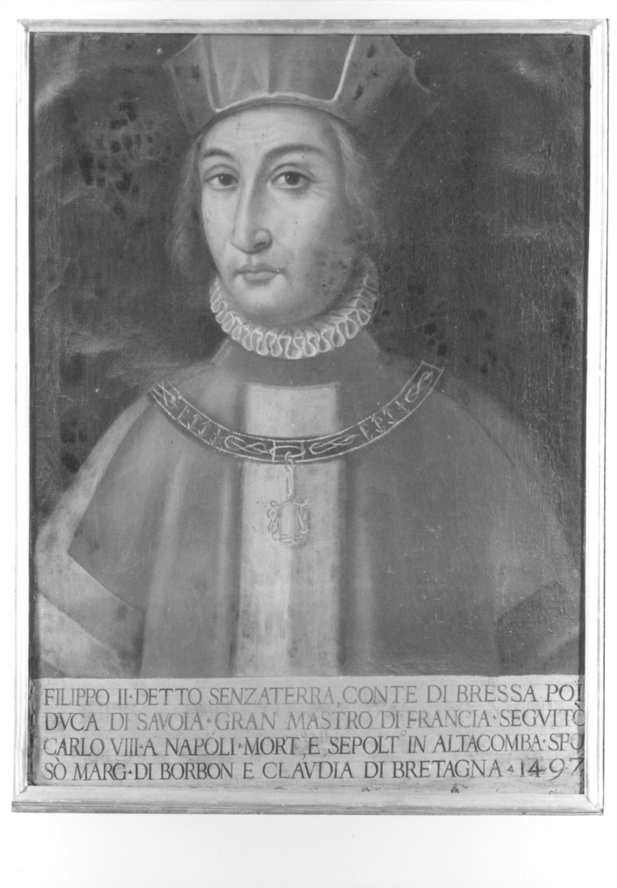 - NOTIZIE STORICO CRITICHE Nel castello di Agliè si conservano alcuni ritratti facenti parte di una serie dedicata agli antenati di Casa Savoia, documentata già nell'inventario del 1776 (in ASTO, Archivio Duca di Genova, Tenimento di Agliè, m. n. 50); allo stato attuale si tratta di una collezione di modeste dimensioni ma in passato contava centinaia di dipinti, di qualità e mani diverse. Nel corso dei secoli la serie fu incrementata ed in epoca ottocentesca resa omogenea attraverso alcuni interventi di ritocco delle pitture, di adeguamento di formato e di aggiunta o modifica delle iscrizioni presenti nella parte inferiore. Spesso tali interventi compromettono la lettura dell'effigie originaria e pongono notevoli problemi di datazione delle opere, che riflettono solo più la fase ottocentesca, e soltanto dopo un attento restauro si potrà definire con maggiore precisione l'epoca di esecuzione. Allo stato attuale si propone una datazione al XVII secolo, che tenga conto però dei forti rimaneggiamenti subiti dalle opere, anche se non si esclude che alcune possano essere soltanto copie ottocentesche di ritratti andati dispersi. La catena inventariale purtroppo è imprecisa poichè spesso le identificazioni proposte nei registri storici sono generiche e si riferiscono a gruppi di opere omogenee per soggetti. Il dipinto in esame ritrae Filippo II di Savoia (1443-1497), detto Senzaterra, che sposò nel 1472 Margherita di Borbone ed in seconde nozze Claudina di Bretagna nel 1485