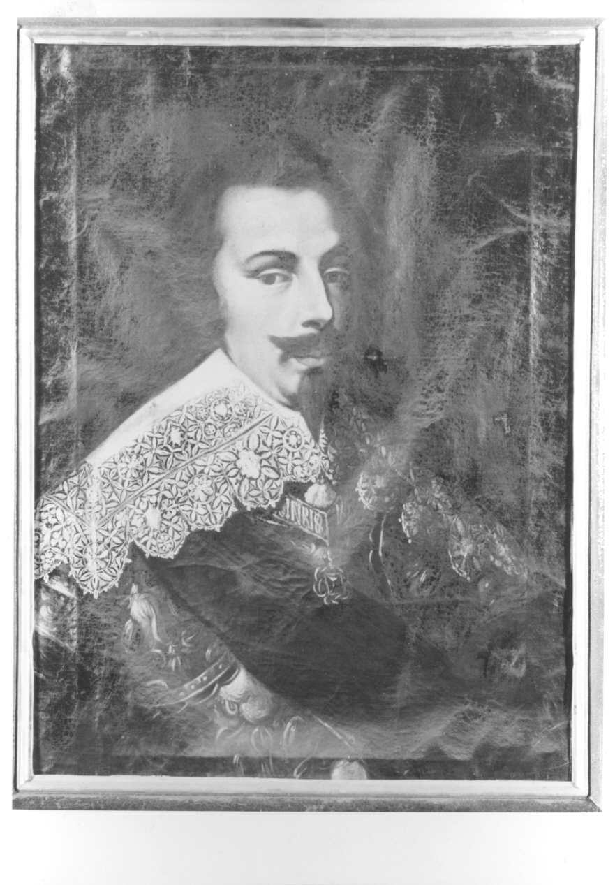 - NOTIZIE STORICO CRITICHE Nel castello di Agliè si conservano alcuni ritratti facenti parte di una serie dedicata agli antenati di Casa Savoia, documentata già nell'inventario del 1776 (in ASTO, Archivio Duca di Genova, Tenimento di Agliè, m. n. 50); allo stato attuale si tratta di una collezione di modeste dimensioni ma in passato contava centinaia di dipinti, di qualità e mani diverse. Nel corso dei secoli la serie fu incrementata ed in epoca ottocentesca resa omogenea attraverso alcuni interventi di ritocco delle pitture, di adeguamento di formato e di aggiunta o modifica delle iscrizioni presenti nella parte inferiore. Spesso tali interventi compromettono la lettura dell'effigie originaria e pongono notevoli problemi di datazione delle opere, che riflettono solo più la fase ottocentesca. Alcune tele sembrerebbero risalire al XVII secolo, tra cui quella in esame raffigurante Vittorio Amedeo I di Savoia (Torino 1587-Vercelli 1637), sposatosi nel 1618 Cristina di Francia e diventato duca di Savoia nel 1630, alla morte del padre Carlo Emanuele I. Anche in questo caso le ridipinture sono piuttosto evidenti (il collare dell'Annunziata non reca più il motto FERT ma l'iscrizione INRI, non pertinente, e il pendente sembra una pietra preziosa e non una raffigurazione dell'Annunziata) e così anche l'intervento di modifica del formato (la tela è molto più ampia del telaio e sul lato posteriore sono ripiegati due lati piuttosto ampi)ma sembrerebbero aggiunte ad un sostrato originario. La catena inventariale purtroppo non è precisa poichè spesso le identificazioni proposte nei registri storici sono generiche e si riferiscono a gruppi di opere omogenee per soggetti (si ricorda che in castello si conservano altri ritratti di Vittorio Amedeo I). Numerosi sono i confronti iconografici con immagini note di Vittorio Amedeo I, per cui si rimanda all'incisione di Giovenale Boetto inserita nel manoscritto "Historia della vita del duca di Savoia Vittorio Amedeo I, re di Cipro" di Valeriano Castiglione e al celebre ritratto di Giovanna Garzoni conservato nella Galleria degli Uffizi di Firenze pubblicati in "Figure del barocco in Piemonte. La corte, la città, i cantieri, le provincie", a cura di Giovanni Romano, Torino 1998, pp. 12; 43. Si ricorda inoltre il dipinto conservato al castello di Racconigi, databile alla seconda metà del XVII secolo, per il quale Michela di Macco indica un prototipo forse riconducibile "all'attività di Cairo, ritrattista per Vittorio Amedeo e Cristina di Francia" aggiugendo che "la preziosa descrizione dell'abito rimanda ad un modello di cultura francese" (in "Diana trionfatrice. Arte di corte nel Piemonte del Seicento", a cura di G. Romano-M. di Macco, Torino, 1989, p. 20 n. 20) e a due ritratti del duca conservati al Quirinale (cfr. Laureati L.-Trezzani L. "Il patrimonio artistico del Quirinale. Pittura antica. La quadreria". Milano 1993, p. 201 nn. 232-233)