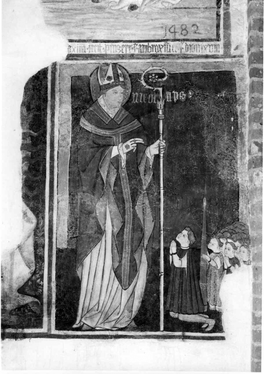 San Nicola vestito con abiti vescovili, veste bianca, piviale rosso e verde, con bastone pastorale, benedice un gruppo di devoti inginocchiati. A sinistra frammento con parte di veste con panneggi e raggi di una probabile ruota (forse riferibile a Santa Caterina)