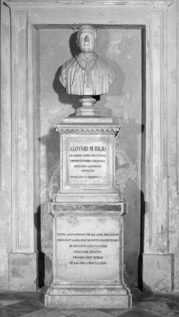 • ISCRIZIONI sul fronte - ALOYSIO M. BILIO/ EX CONGR. CLERIC. REG S.TI PAULI/ EMINENTISSIMO CARDINALI/ EPISCOPO SABINENSI/ CONCIVES/ AMORIS LUCTUS OBSEQUII CAUSA NATUS ALEXANDRIAE VIII KAL APRIL. MDCCCXXVI/ BIDUO POST SACRO HEIC DE FONTE SUSCEPTUS EST/ DE RELIGIONE SANCTA Q. SEDE/ PRAECLARE MERITUS/ PIISSIME OBIIT ROMAE/ III KAL FEB. A. MDCCCLXXXIV - lettere capitali - a incisione - latino