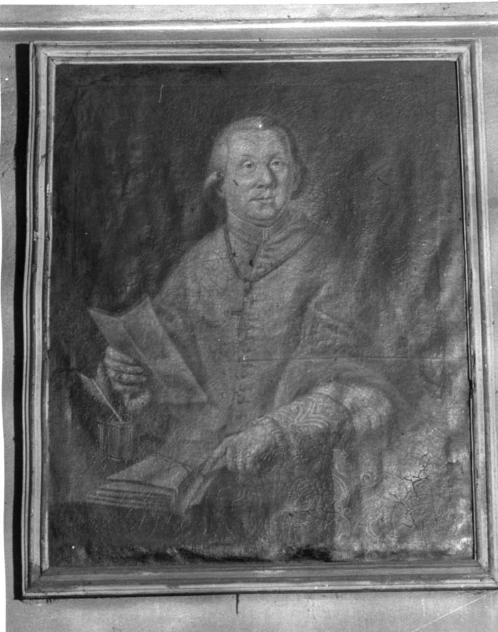 - NOTIZIE STORICO CRITICHE Non è possibile identificare con certezza il personaggio ritratto, che veste comunque abiti vescovili. Essendo il dipinto chiaramente riferibile al XVIII secolo, può trattarsi con buona probabilità di monsignor Giovanni Mercurino Arboreo di Gattinara (1730-1743) o di monsignor Alfonso Miroglio (1744-1755), i cui ritratti sono menzionati negli Inventari della spettanza del Capitolo dal 1773 al 1840, unitamente ad altri ritratti di vescovi e canonici la cui identità è però nota grazie all'iscrizione apposta dagli stessi