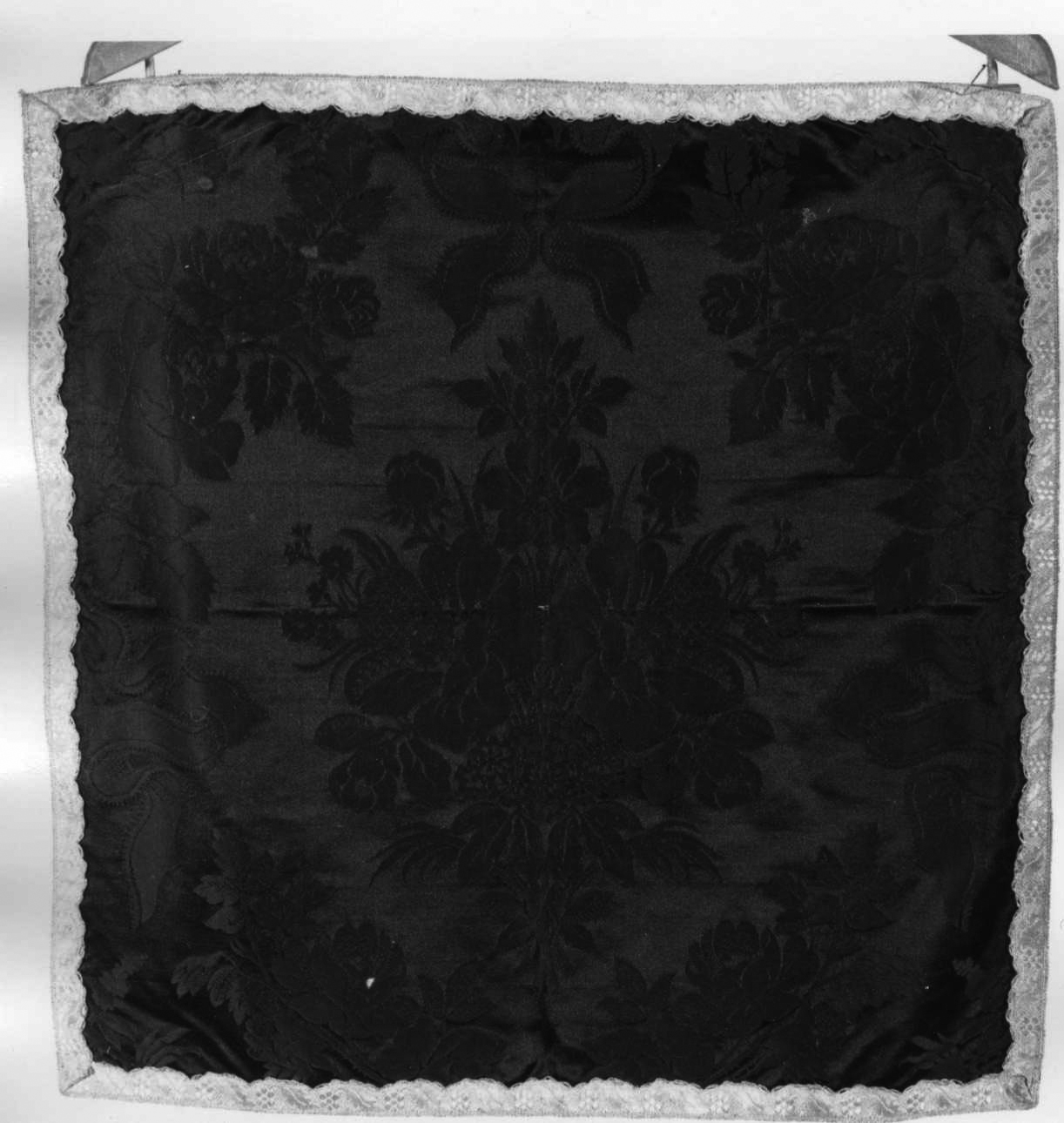 Velo di calice il cui disegno presenta due rami con grandi rose in fiore ed altre in boccio tra foglie fitte, trattenuti insieme da un nastro che scende in eleganti volute, che si divaricano per accogliere un soprastante mazzo di fiori diversi. Ordito e trama in seta nera. Fondo e disegno del tessuto sono prodotti dai fili di un'unica catena nera e dall'unica trama in seta del medesimo colore. Gli effetti derivano dal contrasto lucido/opaco delle due facce della stessa armatura raso. Fodera in tela nera. Galloni in argento filato e lamellare, eseguiti a telaio