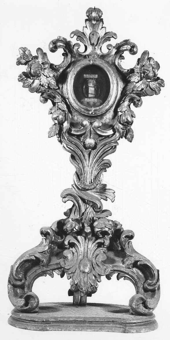 Su base ovale modanata e sagomata salgono tre piedi decorati con motivi vegetali, confluenti in un fusto pure similmente decorato; più in alto la struttura si amplia a circondare una nicchia ovale con vetro, intorno alla quale stanno altri motivi vegetali e floreali