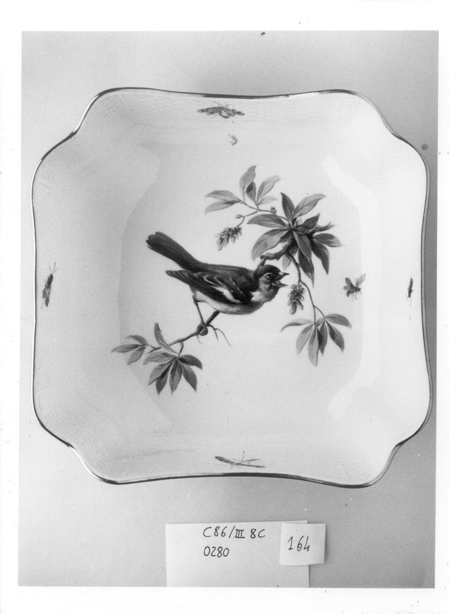 - NOTIZIE STORICO CRITICHE Casa Savoia si distingue nello scorcio dell'Ottocento per l'ordinazione di servizi orientati al gusto "neo-rococò" delle Manifatture di Berlino e di Meissen. Per Meissen le richieste si collegavano spesso anche all'esigenza di replicare molto oggetti facenti parte dei vecchi servizi provenienti dalle collezioni dei Borbone di Parma e dei Lorena, ormai ampiamente decurtati di molti pezzi (A. D'AGLIANO, "Porcellane e argenti", cit, scheda n. 75, pp. 241-242). Il presente servizio, che contava originariamente più di 2000 pezzi, molti dei quali furono ceduti al Palazzo del Quirinale il 6 agosto 1951, fu acquistato il 16 maggio 1986 (1882. "Argenti Vasellame", bolletta di carico n. 16) e corrisponde appieno al tipo di revival "neo-rococò" di cui si è detto, che la Manifattura di Meissen alimentava assecondando le aspettative del pubblico dei prodotti di porcellana. In particolare il servizio torinese si avvale del decoro pittorico "Deutsche Vogel" e di un bordo a rilievo "Alt Ozier", che si rifanno a modelli del 1736, di J. F. Eberlein (A. D'AGLIANO, in "Porcellane e argenti del Palazzo Reale di Torino", catalogo della mostra a cura di A. GRISERI e G. ROMANO, Milano 1986, scheda n. 75, pp. 241-242). La consistenza di questa serie nell'inventario del 1882 è di 6 esemplari
